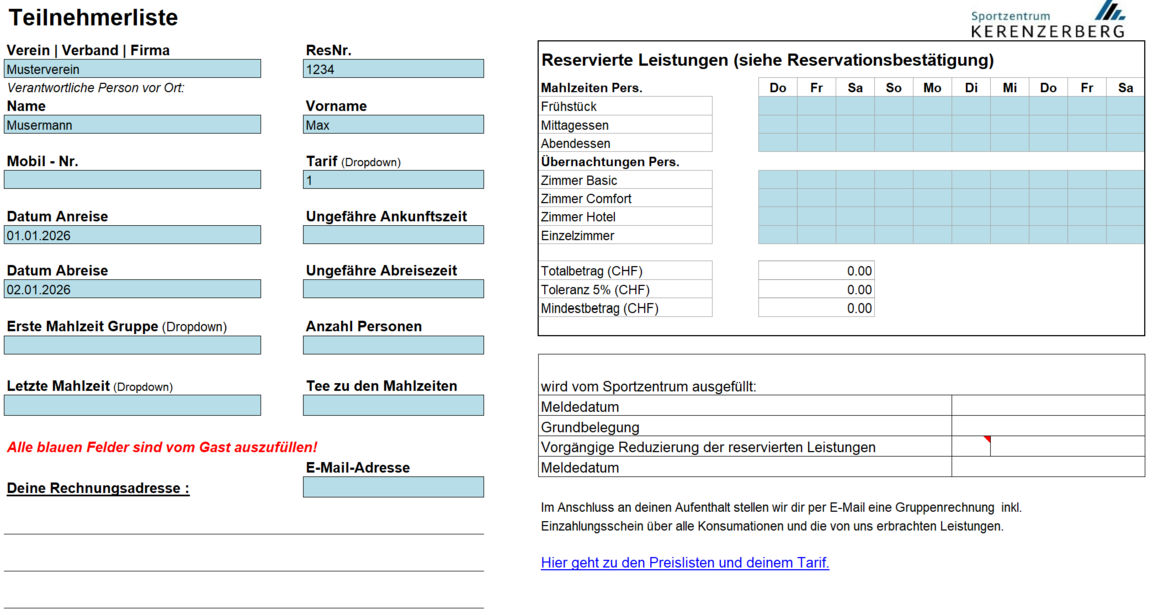 für Detailinfos die "Gästeliste" und die "Liste Sportzentrum" ausfüllen